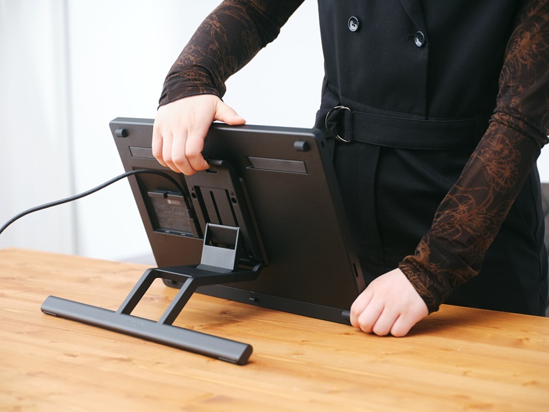 Wacom Cintiq 16 內建可折疊腳架,全平的機身在腳架展開後可與桌面呈 20°夾角。Wacom Cintiq 24 touch 均配備了新款 Wacom 可調式腳架,可讓您根據自己的創作姿勢和視線水準,穩定、安靜地調節螢幕角度。該新款腳架也適用於 Wacom Cintiq 16,用戶如需更多調節角度可另行搭配購買。Wacom Cintiq 兩個尺寸均支援 VESA 75x75公釐腳架底座,適用協力廠商支臂架。